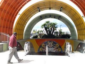 Jim shows the subway mural of El Portal to the tourists from Oregon.