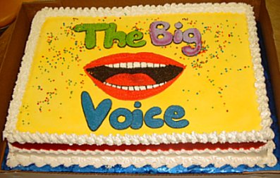 Opening Night Photo Album.As I write this on a cool, overcast Saturday morning I am flooded with the wonderful images of last night. What an explosively exciting opening night. The house was full. The laughs and the applause stopped the show time after time. And now we know, our third "test market" -- the south -- is just as, if not more, accepting of Big Voice than Los Angeles and New York. This bodes really well for the future of the show as we continue to find ways to market what we have.From the opening lines to the final "So goodbye!" the entire place was with us, totally and completely. Before the show even started, Ron and Kenn showed us the big opening night cake they had done at a Mexican bakery.