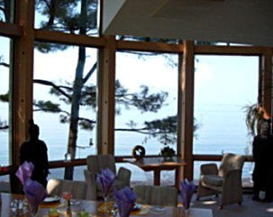 The room-high windows give a spectacular view of the lake.
