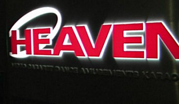 Heaven's lobby sign lit up at night.