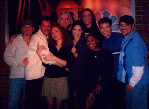 The whole NY cast with friends at MSNBC. From left to right: Anthony Galde (The Fix, Absolom in King David), producer Michael Alden, Amy Coleman, Jim Brochu, Soledad Obrien from MSNBC, Bob Stillman pointing to the word "connected," Grace Garland showing leg, Stephen Bienskie and producer Carl D. White.